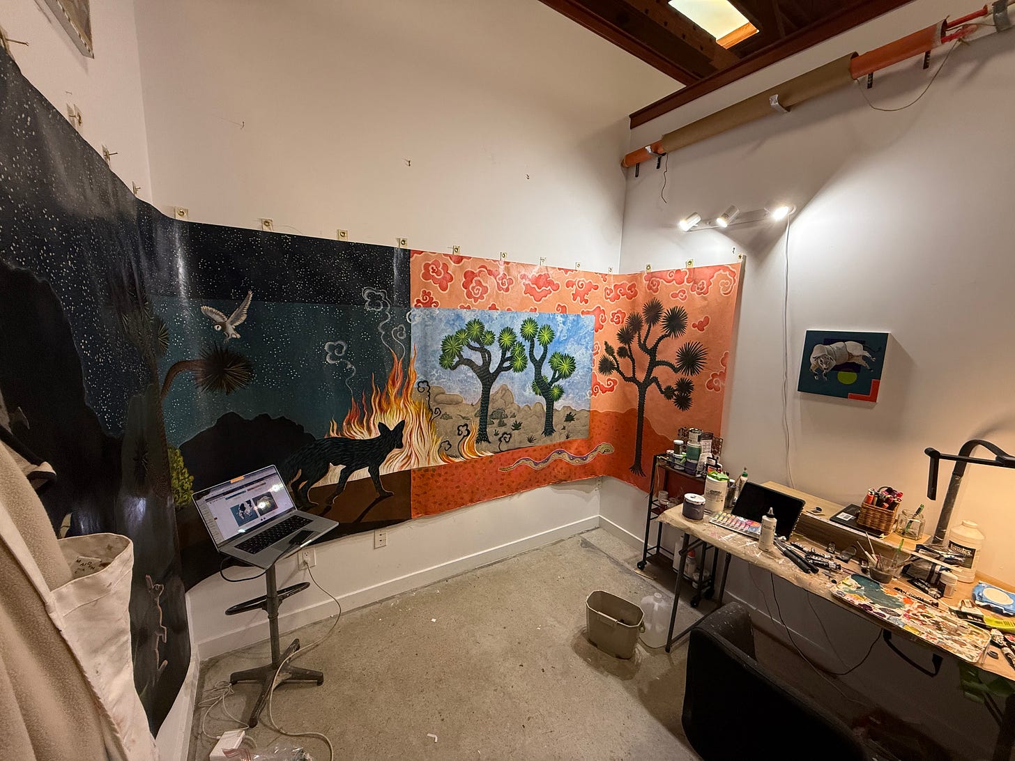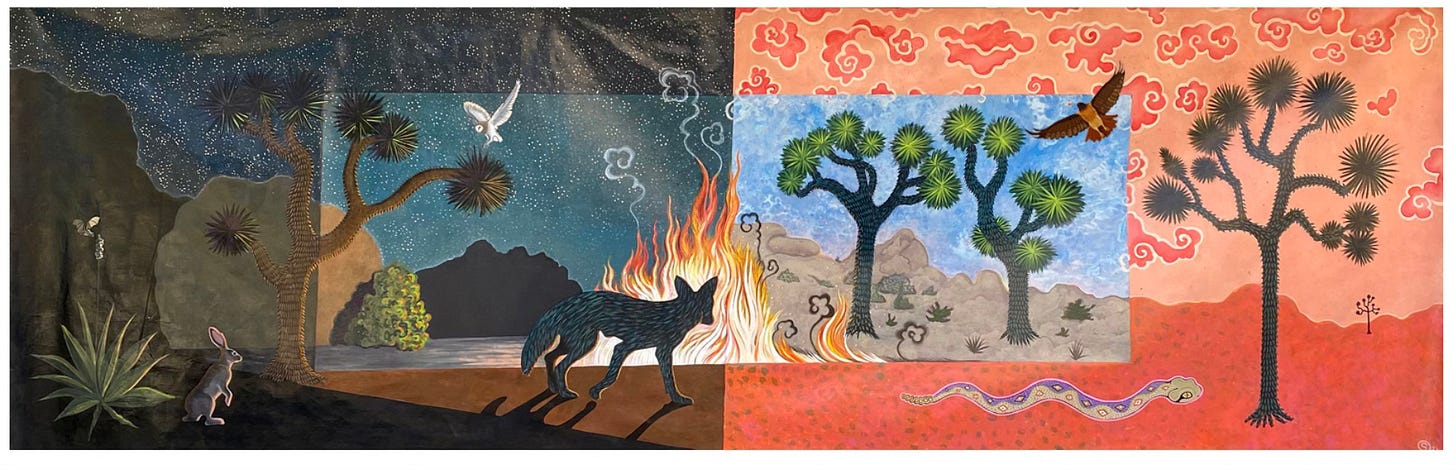 One big painting I’m hoping to find a home for before I leave CA is my “Desert Fire” mural. I plan to make this mural available as an “in-kind” donation to a nature non-profit. Do you know any Nature NPs that would be interested in this big (60” x 192”) desert mural? It would look great in someone’s visitor’s center! LMK.